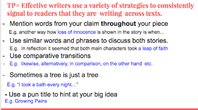 On Friday you must turn in your summative reading across text. You will receive the second story in class tomorrow. The rest of the week you'll be given time to read and reread both stories and find connections that go across both texts. You'll be able to select your own medium to show your thinking. For example, photography, art, music, image etc.